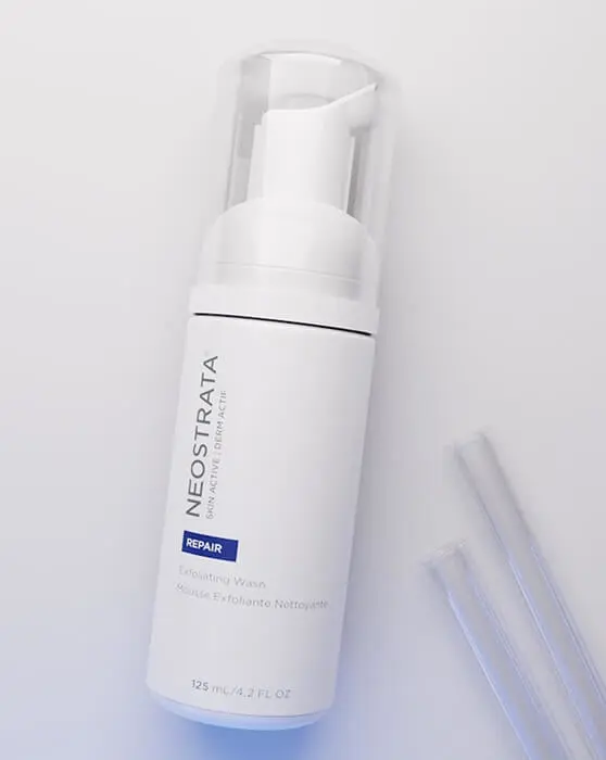 Cleanser: NEOSTRATA® SKIN ACTIVE Exfoliating Wash with Polyhydroxy Acids (PHAs) including Maltobionic Acid known to exfoliate and remove debris from pores, enhancing skin texture and clarity. The foaming formula with a concentrated botanical complex of aloe, chamomile, cucumber and rosemary extracts helps refresh and revitalize.